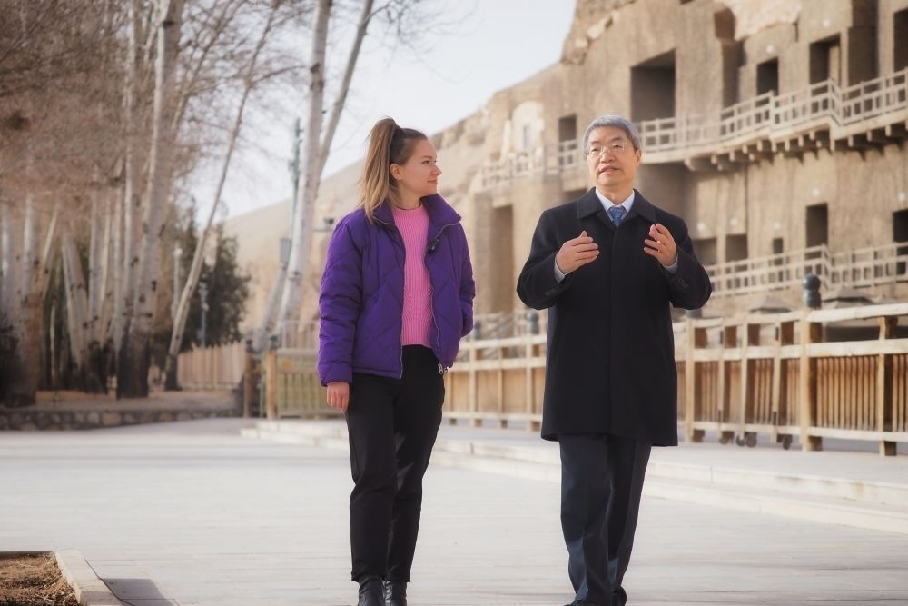 3月16日,新華社外籍記者達莎在莫高窟前同敦煌研究院黨委書記趙聲良交流。新華社記者趙宇攝