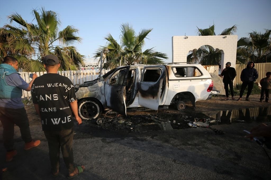 ?4月2日,在加沙地帶中部代爾拜拉赫,巴勒斯坦人在空襲過后查看被毀的汽車。巴勒斯坦紅新月會(huì)2日發(fā)表聲明說(shuō),以色列軍隊(duì)1日晚空襲加沙地帶中部城市代爾拜拉赫,造成慈善組織“世界中央廚房”7名工作人員死亡。新華社發(fā)(亞西爾·庫(kù)迪攝)