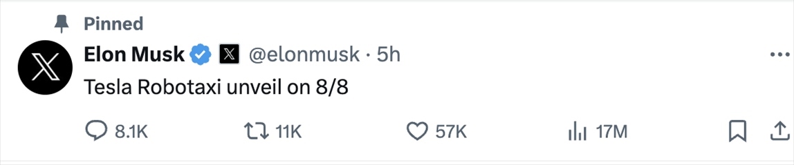 此外值得一提的是,美股收盤后,馬斯克還在X上丟出了一記重磅消息,他宣布特斯拉將在8月8日發(fā)布Robotaxi。