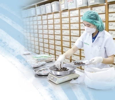 泰國華僑中醫(yī)院藥房內,工作人員在稱量中藥。 張慧珊攝