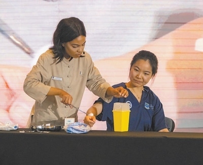 在2023年舉行的第二十二屆“漢語橋”世界大學生中文比賽南非賽區(qū)決賽中,來自西開普大學中醫(yī)孔子學院的學生希諾(左)展示針灸治療。 本報記者 鄒 松攝