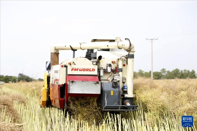4月17日,一臺從中國引進的油菜籽收割機在巴基斯坦東部旁遮普省珀格爾地區(qū)一處農(nóng)田進行收割作業(yè)。新華社發(fā)(艾哈邁德·卡邁勒攝)