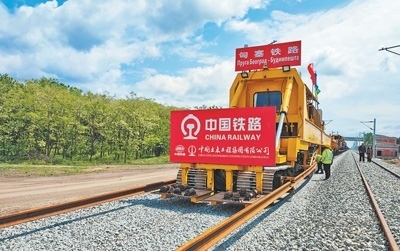 近日,在塞爾維亞和匈牙利邊境地區(qū)的塞爾維亞一側(cè),匈塞鐵路項(xiàng)目施工人員利用鋪軌車等中國設(shè)備進(jìn)行鋪軌作業(yè)。