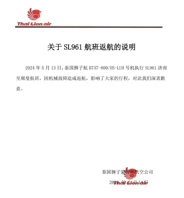 央視網(wǎng)消息:據(jù)泰國獅航公眾號消息,5月15日泰國獅航發(fā)布關(guān)于SL961航班返航的說明,2024年5月13日,泰國獅航B737-800/HS-LUH號機(jī)執(zhí)行SL961濟(jì)南至曼谷廊曼航班,因機(jī)械故障造成返航。該航司對此致歉。