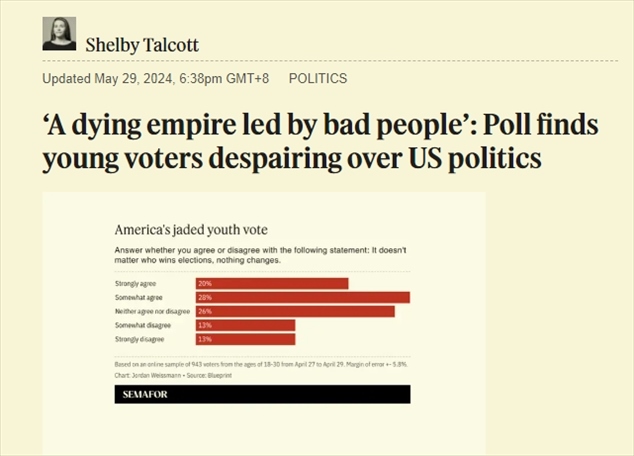 中國日報(bào)網(wǎng)5月30日電 當(dāng)?shù)貢r(shí)間29日,美國媒體Semafor網(wǎng)站報(bào)道,民主黨戰(zhàn)略組織“Blueprint”公布的一項(xiàng)最新民意調(diào)查顯示,美國18歲至30歲的選民中至少有一半人對美國的政治制度持負(fù)面看法,其中超過60%的人認(rèn)為美國正在衰落。