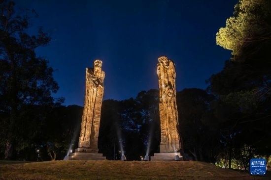 這是5月29日在烏拉圭首都蒙得維的亞市中心的巴特列公園拍攝的雕塑作品《問道》(無人機照片)。新華社發(fā)(尼古拉斯·塞拉亞攝)