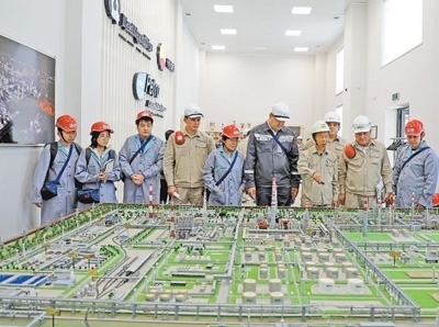 人民日報和哈薩克斯坦媒體“高質(zhì)量共建‘一帶一路’”聯(lián)合采訪團隊近日來到哈薩克斯坦奇姆肯特市,采訪了奇姆肯特煉廠現(xiàn)代化改造項目。圖為聯(lián)合采訪團隊在奇姆肯特煉廠沙盤前聽取情況介紹。本報記者 趙益普攝