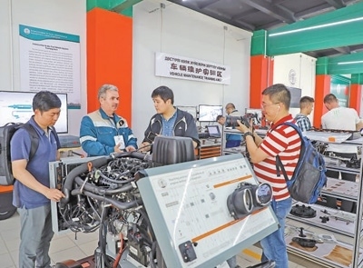 哈薩克斯坦魯班工坊位于東哈薩克斯坦州首府厄斯克門,由天津職業(yè)大學與東哈薩克斯坦技術(shù)大學共同承建。圖為在魯班工坊車輛維護實訓區(qū),聯(lián)合采訪團隊正在對哈方技術(shù)人員進行采訪。本報記者 趙益普攝
