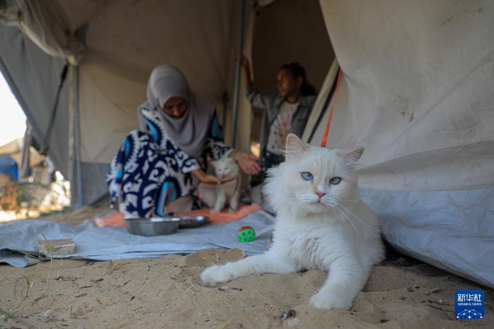這是8月22日在加沙地帶南部城市汗尤尼斯拍攝的帳篷旁的貓。