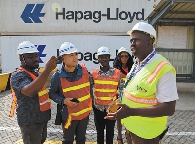 中加兩國媒體記者在特馬新集裝箱碼頭采訪工作人員。本報(bào)記者 張志文攝