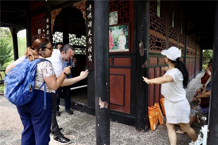 紫藤纏繞,荷葉連綿,位于四川成都新都區(qū)的桂湖公園一片綠意盎然。桂湖公園始建于隋唐時期,是一座自然環(huán)境幽雅、人文底蘊深厚的古典園林。8月30日,2024年“一帶一路”媒體合作論壇拉美媒體采訪團來到這里參觀。