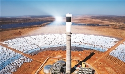在南非北開普省拍攝的南非紅石100兆瓦塔式熔鹽光熱電站項(xiàng)目。新華社記者 張譽(yù)東攝