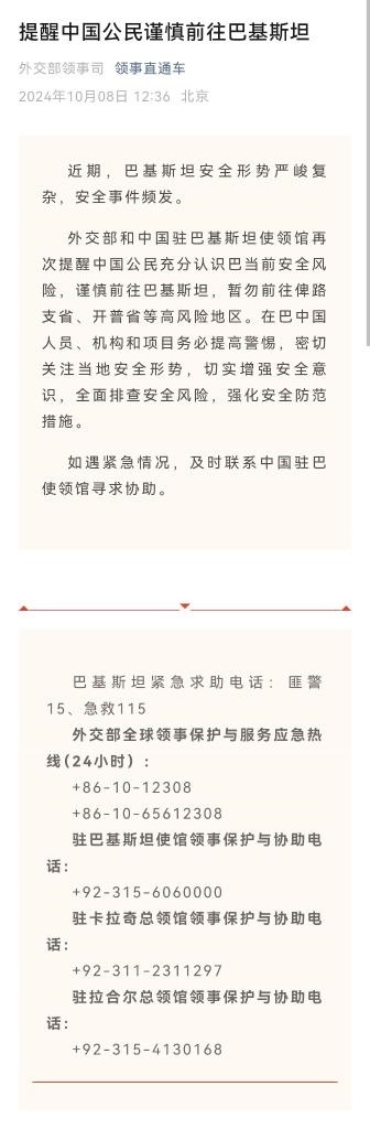 據(jù)外交部“領(lǐng)事直通車”微信公眾號(hào)10月8日消息,近期,巴基斯坦安全形勢(shì)嚴(yán)峻復(fù)雜,安全事件頻發(fā)。