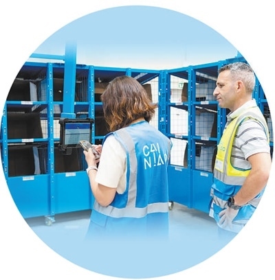 在菜鳥西班牙海外倉(cāng),兩名工作人員正在使用菜鳥自主研發(fā)的智能分揀柜系統(tǒng)進(jìn)行包裹分揀。 本報(bào)西班牙分社 大衛(wèi)·阿瑪爾攝