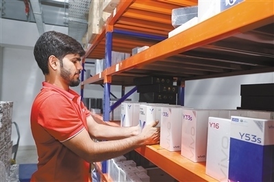 中國(guó)企業(yè)位于巴基斯坦的海外倉(cāng)將中國(guó)制造的數(shù)碼產(chǎn)品等高附加值貨物快速配送至本地線下零售商網(wǎng)絡(luò),顯著提升效率和靈活性。圖為海外倉(cāng)的送貨員正在與當(dāng)?shù)厣虘艚唤迂浳?。本?bào)巴基斯坦分社 賽義德·邁赫迪攝