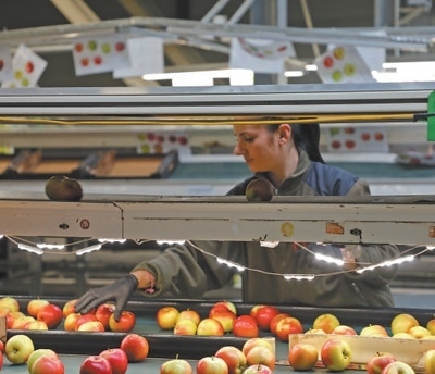 波蘭格魯耶茨縣一家蘋果加工企業(yè)內(nèi),當(dāng)?shù)毓と苏诜謷O果。本報(bào)記者 禹麗敏攝