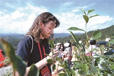 2024“鼓嶺緣”中美青年交流周期間,北京大學(xué)燕京學(xué)堂研一的美國學(xué)生葛逸思在為種植的友誼樹寫上寄語。新華社記者 林善傳攝