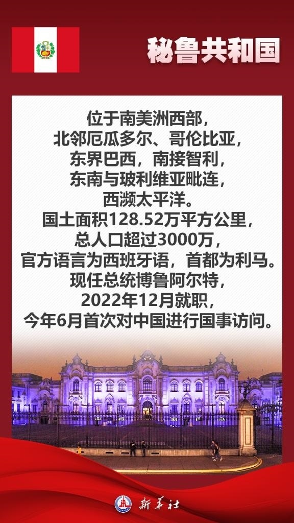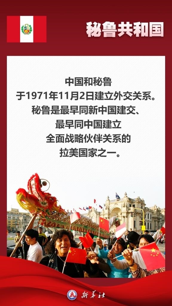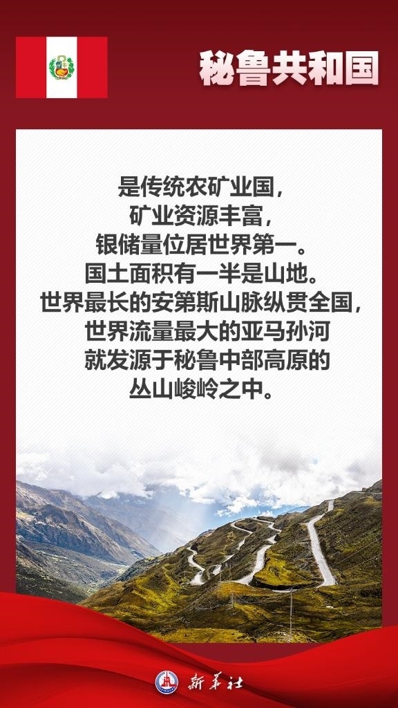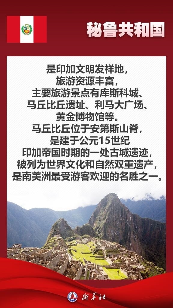 應(yīng)秘魯共和國總統(tǒng)博魯阿爾特邀請,國家主席習(xí)近平將于11月13日至17日赴利馬出席亞太經(jīng)合組織第三十一次領(lǐng)導(dǎo)人非正式會議并對秘魯進(jìn)行國事訪問。秘魯位于南美洲西部,是印加文明發(fā)祥地,也是最早同新中國建交的拉美國家之一。關(guān)于秘魯,七張海報(bào)帶你了解更多——
