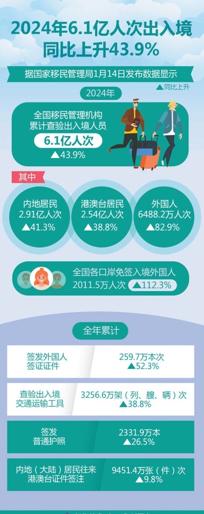 在2024年中國(guó)國(guó)際傳播年度熱詞榜上,“中國(guó)游”一詞名列前十。中國(guó)全面放寬優(yōu)化免簽政策,推出一系列便利外國(guó)人來華政策舉措,“中國(guó)游”成為越來越多外國(guó)游客的優(yōu)先選擇。中國(guó)國(guó)家移民管理局最新數(shù)據(jù)顯示,2024年,全國(guó)移民管理機(jī)構(gòu)累計(jì)查驗(yàn)出入境人員6.1億人次,同比上升43.9%;其中內(nèi)地居民2.91億人次、港澳臺(tái)居民2.54億人次、外國(guó)人6488.2萬人次,同比分別上升41.3%、38.8%、82.9%。全國(guó)各口岸免簽入境外國(guó)人2011.5萬人次,同比上升112.3%。說走就走的“中國(guó)游”打開了世界了解中國(guó)的新窗口、新通道,向全球展現(xiàn)真實(shí)、多元和活力滿滿的中國(guó)形象。