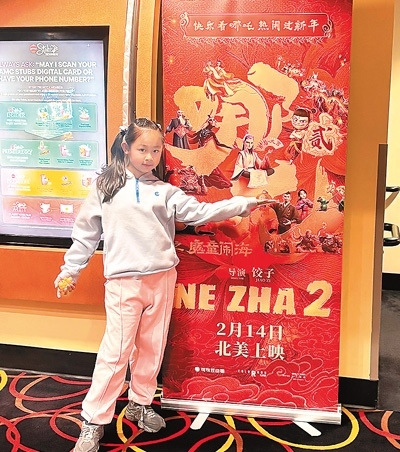 圖為唐夢(mèng)竹的女兒在美國洛杉磯一家影院的《哪吒之魔童鬧?!沸麄骱?bào)前留影。