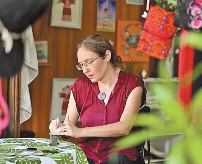 謝敏來自美國(guó)芝加哥,曾是一名英語(yǔ)老師的她,如今稱自己為設(shè)計(jì)師、小店店主。謝敏的小店叫“海島樂趣”,位于海南海口白沙門公園內(nèi)。“這是五指山市的黎錦手提包,這是保亭村子里的織品,那幾件是東方市的?!钡昀飻[放的黎錦作品出自海南各地村民之手,謝敏如數(shù)家珍。店中還有不少她親手設(shè)計(jì)和制作的文創(chuàng)產(chǎn)品,靈感都來自魚、烏龜、閃電等傳統(tǒng)黎錦紋樣。