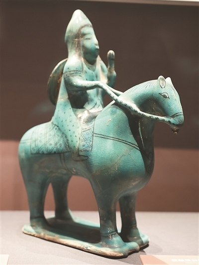 綠松石色釉小型樂隊模型為公元12—13世紀(jì)的作品,其結(jié)構(gòu)呈方形,表現(xiàn)了樂隊演奏或宴會場景,11名樂手分別演奏鐃鈸、鼓、琴、長笛等樂器,場地中央置一果盤。藍(lán)釉黑彩騎士陶塑刻畫了具有東亞特征面孔的騎士形象。騎士頭戴尖頂帽,背負(fù)盾牌,其造型受到中國藝術(shù)的影響。