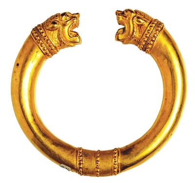在古代伊朗文化中,環(huán)形因形似太陽,是密特拉信仰主神的象征,被賦予存在、原初、創(chuàng)世與永恒等含義。獨(dú)立展柜中陳列著一枚公元前2世紀(jì)的青銅授權(quán)環(huán)。授權(quán)環(huán)又稱“權(quán)力之環(huán)”,象征著權(quán)力的授予,授權(quán)時雙方各從一端握住它。展覽海報上的黃金獅首授權(quán)環(huán),為阿契美尼德王朝(公元前550年—公元前330年)的代表文物。