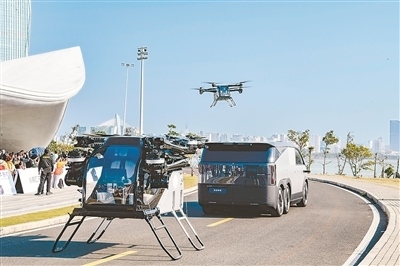 1月21日,海南飛行汽車應(yīng)用示范島項(xiàng)目在海南??趩?dòng),小鵬匯天展示全球首款可在汽車上自動(dòng)分離結(jié)合的電動(dòng)純直起降飛行器。蘇弼坤攝(人民圖片)