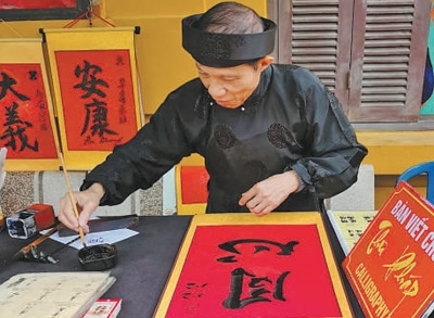 4月13日,在越南河內(nèi)胡志明故居,當(dāng)?shù)貢覟橹袊慰蜁鴮憽巴摹薄?/p>