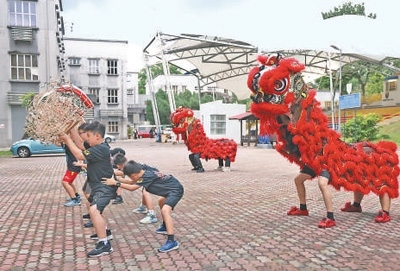 馬來西亞中小學(xué)生在馬來亞大學(xué)醒獅團組織的培訓(xùn)課上練習(xí)舞獅。