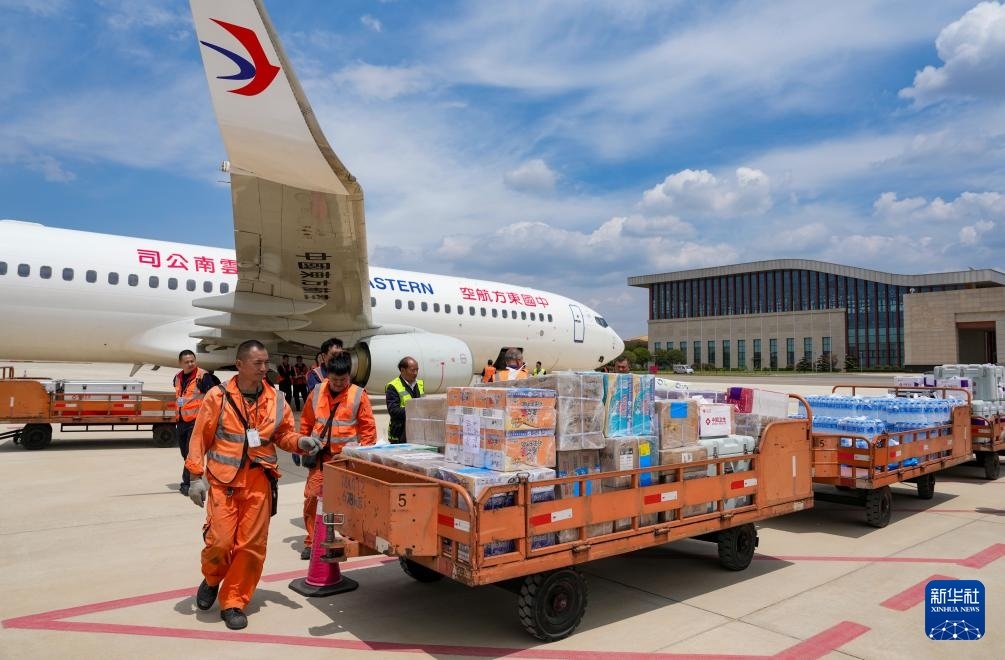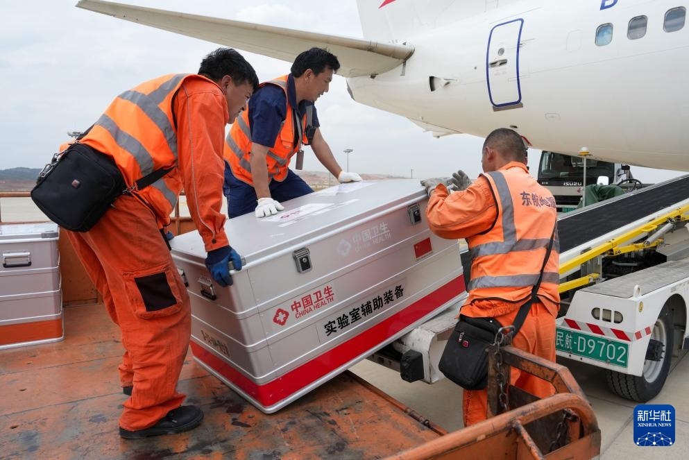 4月19日,工作人員在昆明長(zhǎng)水機(jī)場(chǎng)將中國(guó)政府援緬衛(wèi)生防疫隊(duì)攜帶的物資裝機(jī)。新華社記者 陳欣波 攝