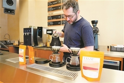 法國(guó)知名精品咖啡烘焙品牌TANAT今年推出兩款產(chǎn)自云南保山紅龍莊園的小??Х犬a(chǎn)品。該品牌首席烘焙師托馬·克萊芒表示,所選的云南咖啡豆口感柔和細(xì)膩,兼具豐富的層次與地域特色。圖為該品牌位于巴黎的一家門店內(nèi),咖啡師在沖泡云南咖啡。