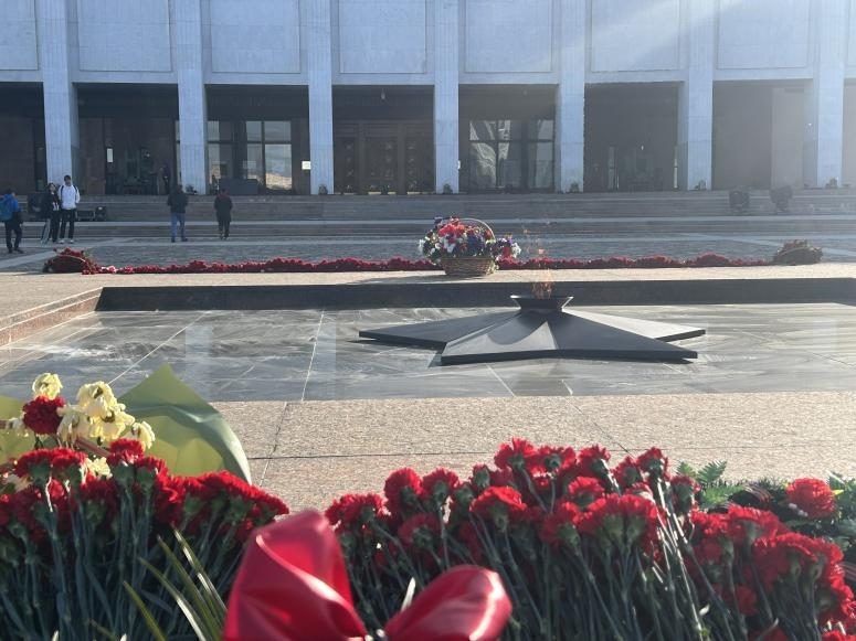 當?shù)貢r間5月6日下午,勝利廣場上的長明火兩側(cè)放滿鮮花。劉少華 攝