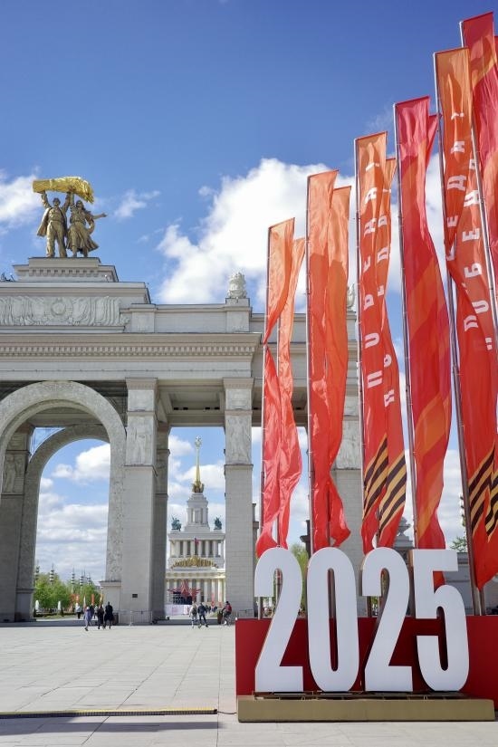 當?shù)貢r間5月6日,莫斯科威登漢(國民經(jīng)濟成就展覽館)大門前一側(cè),布置好了2025標志和紀念旗幟。劉少華 攝