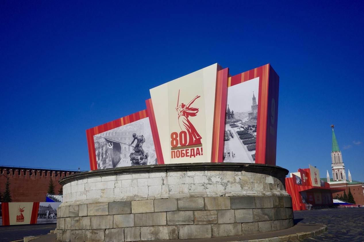 當?shù)貢r間5月6日,位于莫斯科紅場的圣瓦西里教堂前,已經(jīng)布置好了紀念蘇聯(lián)偉大衛(wèi)國戰(zhàn)爭勝利80周年慶典的展板。 劉少華、李建廣 攝