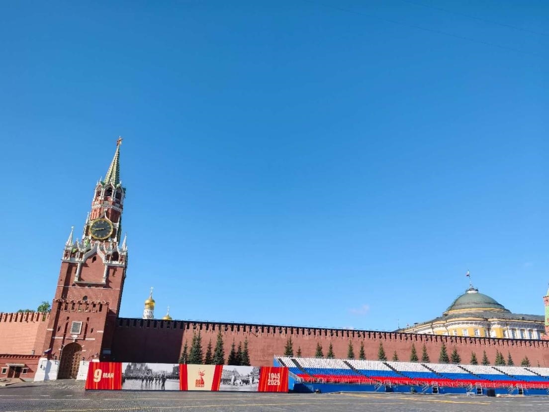 當?shù)貢r間5月6日,莫斯科盧比揚卡廣場布置紀念蘇聯(lián)偉大衛(wèi)國戰(zhàn)爭勝利80周年的標語。鄺西曦 攝
