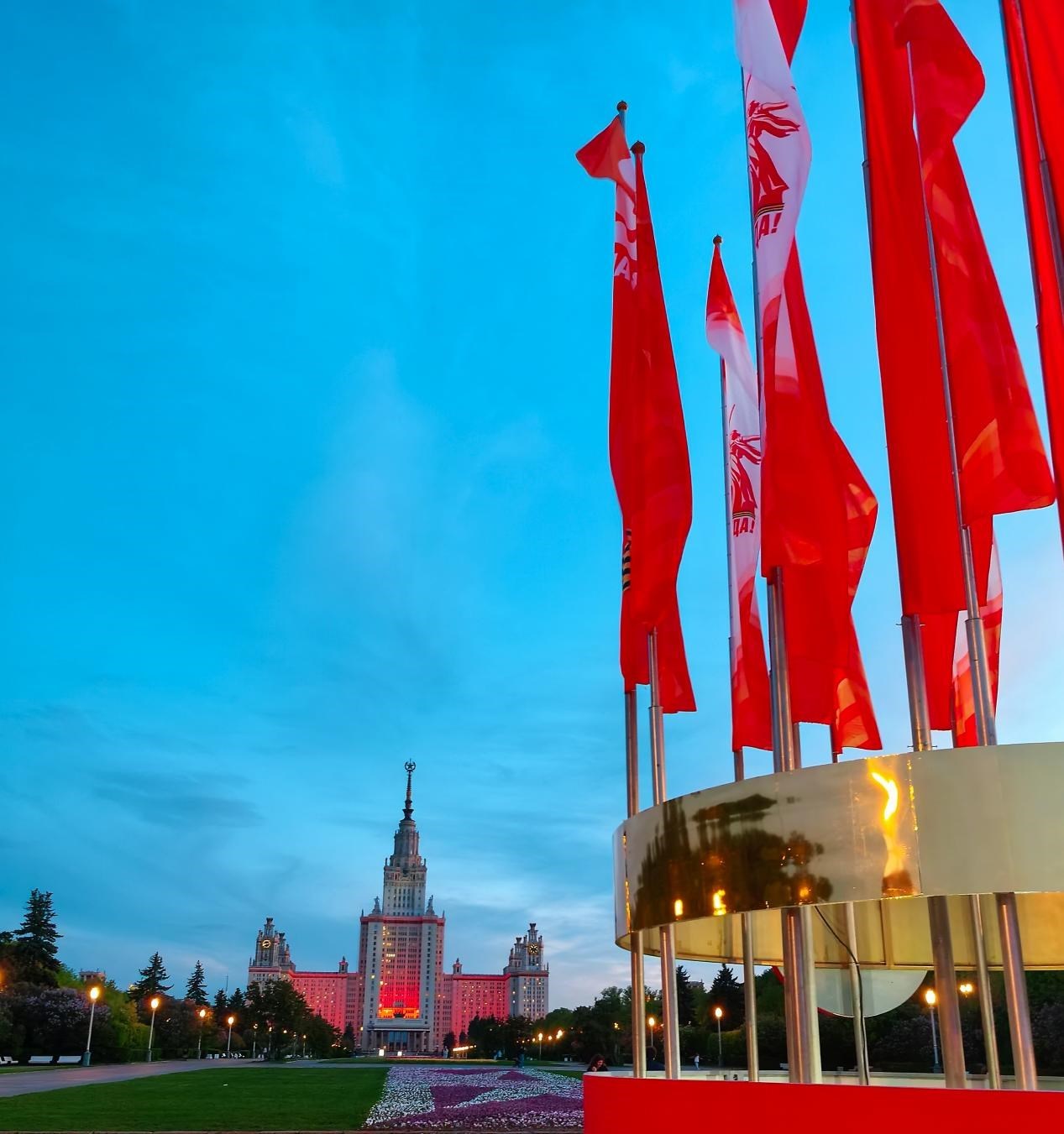 當?shù)貢r間5月6日,莫斯科麻雀山,紀念蘇聯(lián)偉大衛(wèi)國戰(zhàn)爭勝利80周年慶典的旗幟飄揚,與莫斯科國立大學主樓的燈火遙相輝映。 鄺西曦 攝