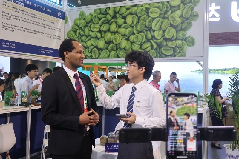 2025年6月14日,在第四屆中國(guó)-非洲經(jīng)貿(mào)博覽會(huì)上,埃塞俄比亞駐華公使內(nèi)比尤·穆罕穆德參加現(xiàn)場(chǎng)直播帶貨。新華社記者 周昊瑾 攝