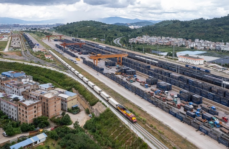 8月23日,前往老撾萬(wàn)象的國(guó)際貨物列車(chē)駛出中老鐵路玉溪研和站。