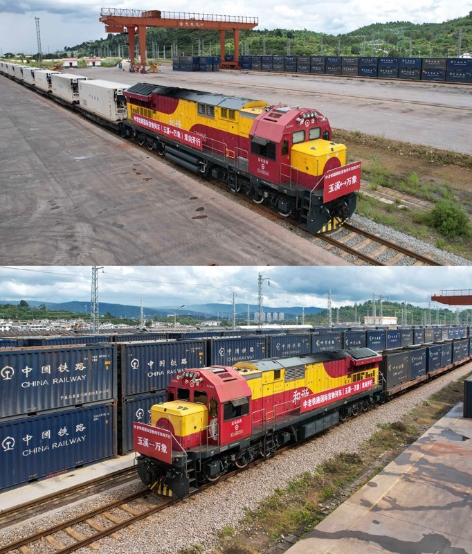 拼版照片:上圖是8月23日在中老鐵路玉溪研和站拍攝的準(zhǔn)備發(fā)車(chē)前往老撾萬(wàn)象的國(guó)際貨物列車(chē)(無(wú)人機(jī)照片);下圖是8月23日拍攝的從老撾萬(wàn)象發(fā)車(chē)并已抵達(dá)中老鐵路玉溪研和站的國(guó)際貨物列車(chē)(無(wú)人機(jī)照片)。