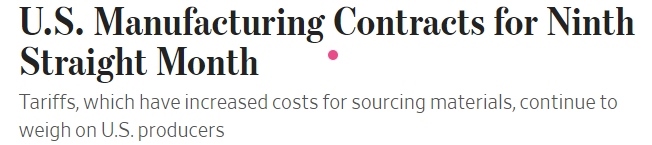 《華爾街日報(bào)》1日發(fā)表文章稱,美國供應(yīng)管理協(xié)會(ISM)當(dāng)天公布的調(diào)查報(bào)告顯示,11月美國制造業(yè)采購經(jīng)理人指數(shù)(PMI)已低于50的榮枯分界線。美國制造業(yè)活動連續(xù)第九個(gè)月萎縮,而美國制造商認(rèn)為這主要是因?yàn)槊绹年P(guān)稅政策。