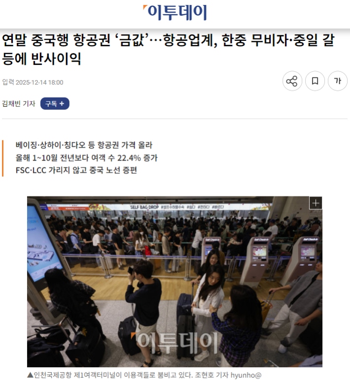市場(chǎng)旺盛的需求直接傳導(dǎo)至價(jià)格層面。韓國《Etoday》近日一篇題為《年底飛往中國的航班“如同黃金般珍貴”》的報(bào)道,生動(dòng)描繪了當(dāng)前中韓航線的熱度。報(bào)道指出,截至12月中旬,韓國飛往北京、上海、青島等主要中國城市的機(jī)票價(jià)格大幅上漲。例如,大韓航空?qǐng)?zhí)飛的首爾-上海往返票價(jià)已漲至約40萬韓元,濟(jì)州航空的韓元-青島航線往返票價(jià)也接近30萬韓元。業(yè)內(nèi)分析指出,即便考慮季節(jié)性因素,當(dāng)前票價(jià)仍比去年同期高出約20%。來往中韓“一票難求”,華燈初上的明洞和外灘,熱氣騰騰的烤肉與火鍋,游客們的熱情互動(dòng)給這個(gè)寒冷的冬天帶來暖意。