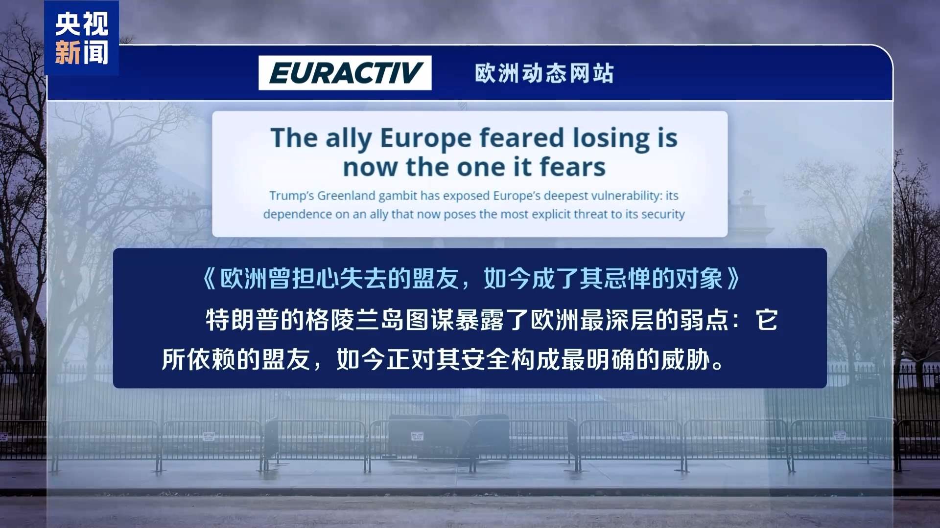 歐洲動(dòng)態(tài)網(wǎng)站6日以《歐洲曾擔(dān)心失去的盟友,如今成了其忌憚的對象》為題評(píng)論說,“特朗普的格陵蘭島圖謀暴露了歐洲最深層的弱點(diǎn):它所依賴的盟友,如今正對其安全構(gòu)成最明確的威脅?!蔽恼逻€提醒說,我們正進(jìn)入一個(gè)“強(qiáng)權(quán)即公理”的新世界——而歐洲人對此毫無準(zhǔn)備?;蛟S,格陵蘭島可能帶來的羞辱,將促使歐洲人反思這一現(xiàn)狀,并最終采取行動(dòng)改變局面。