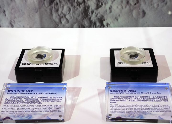 2025年11月5日在第八屆進(jìn)博會(huì)國(guó)家展中國(guó)館拍攝的“嫦娥五號(hào)”月壤和“嫦娥六號(hào)”月壤。新華社記者 劉穎 攝