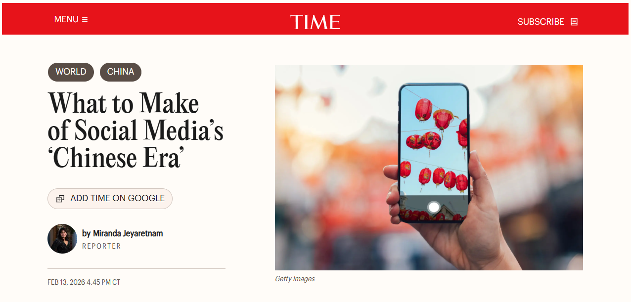 美國《時代》周刊網(wǎng)站2月13日的一篇文章稱,伴隨著今年的中國新年,社交網(wǎng)絡上介紹中國文化的內(nèi)容不少。這是一種新的趨勢,美國社交媒體用戶視自己為“中國人”,擁抱“Chinese era”(中國時代)或者“Chinamaxxing”(極致中國化)。觀察家分析,這一趨勢反映了隨著中國的開放和軟實力的提升,人們對中國越來越著迷。