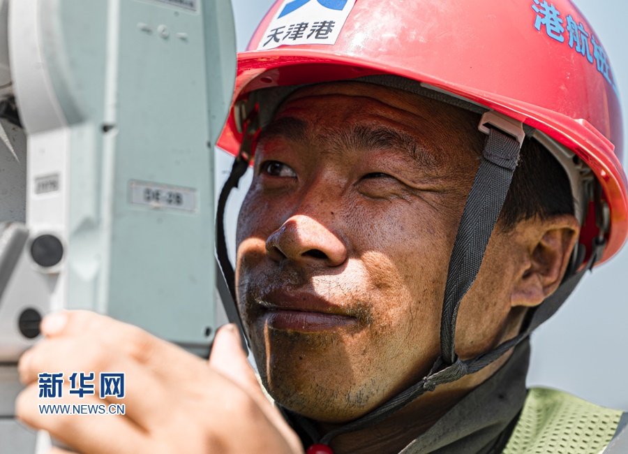 建設(shè)工人冒著酷暑在天津港C段智能化集裝箱碼頭建設(shè)現(xiàn)場(chǎng)做測(cè)量工作。新華網(wǎng)發(fā)