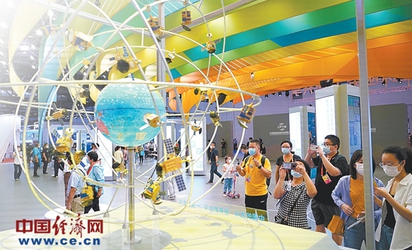 9月5日,觀眾在2020服貿(mào)會(huì)綜合展區(qū)觀看北斗衛(wèi)星模型。經(jīng)濟(jì)日報(bào)-中國經(jīng)濟(jì)網(wǎng)記者趙晶攝