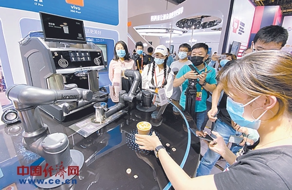 在綜合展區(qū)高通展臺,觀眾們排隊(duì)體驗(yàn)機(jī)器人制作的拉花咖啡。經(jīng)濟(jì)日報(bào)-中國經(jīng)濟(jì)網(wǎng)記者袁勇攝