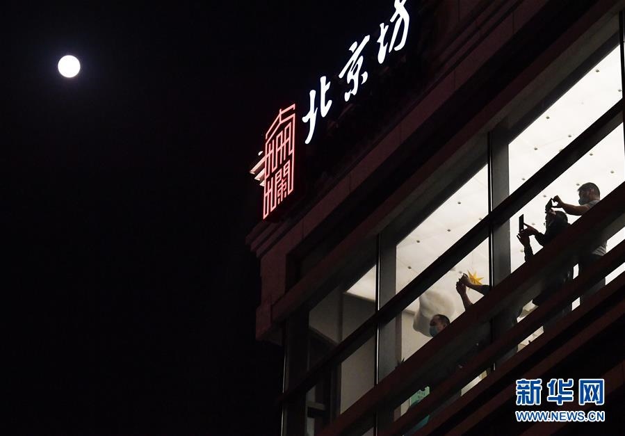 10月1日,幾位游客駐足在北京坊的建筑內(nèi)拍攝夜景。當(dāng)日是農(nóng)歷八月十五,傳統(tǒng)的中秋節(jié)與國(guó)慶節(jié)相遇,共迎圓月。新華社記者李賀攝