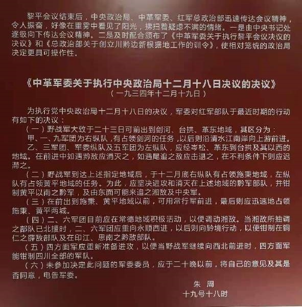 二是中革軍委為執(zhí)行黎平會(huì)議決議及時(shí)作出行動(dòng)部署。